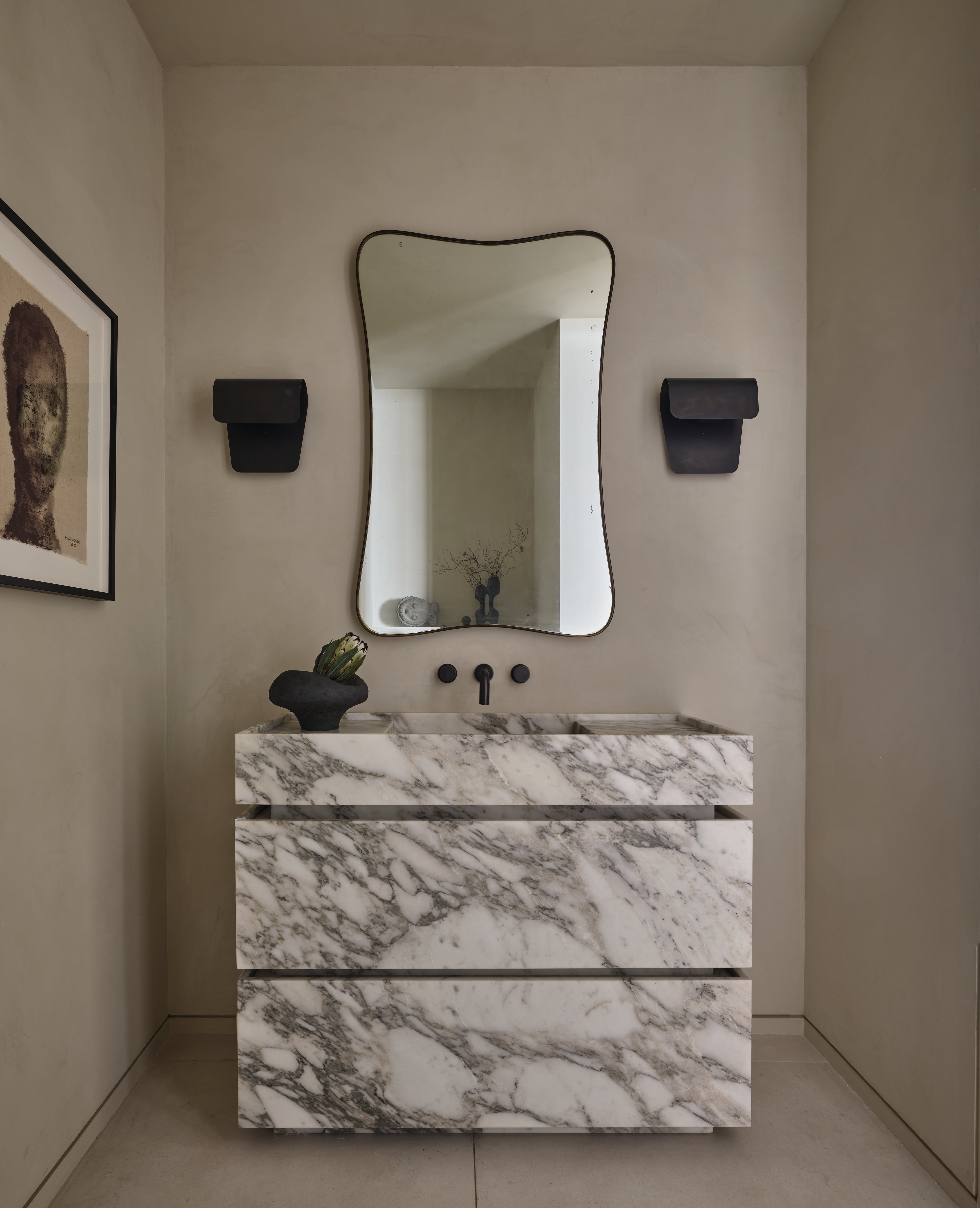 In 2023, Il Granito brought a touch of Italian stone craftsmanship to the iconic Sierra Towers in West Hollywood. Designed by architect Jack A. Charney and completed in 1966, this 31-story landmark is renowned for its sweeping views over Los Angeles and its roster of celebrity residents, including Cher, Sandra Bullock, and Katy Perry. The apartment, curated by Lauri Design, features two signature Alexis vanity units by Il Granito: the Alexis Large in dramatic Calacatta Viola for the master bathroom, and the Alexis Medium in refined Arabescato marble. The master bathroom also incorporates custom fluted tiles in Travertino Rizzi, originally designed and developed in-house by Il Granito. A sleek, sculptural interior where timeless design meets bespoke craftsmanship.