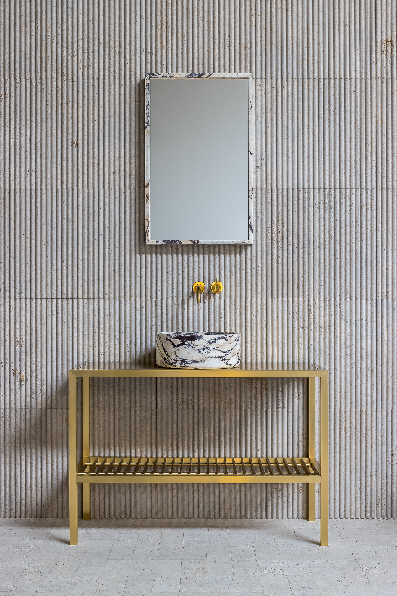 The Oscar Console Vanity combines refined craftsmanship with a bold, contemporary aesthetic. Its sleek frame is available in brushed brass, black, or stainless steel, offering versatility to suit any interior style. The vanity can be paired with a washbasin in natural stone, available in three shapes: round, rectangular with sharp edges, or rectangular with soft rounded corners. A slatted lower shelf provides convenient storage for towels and accessories while maintaining the light, elegant look. With multiple frame finishes and stone options, the Oscar is designed to adapt seamlessly to both modern and classic interiors.